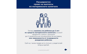 - Дополнительно устанавливается возможность оформить выплату из материнского капитала для всех детей до 3 лет, вне зависимости от очередности рождения, если доход семьи — меньше 2 прожиточных минимумов на человека.