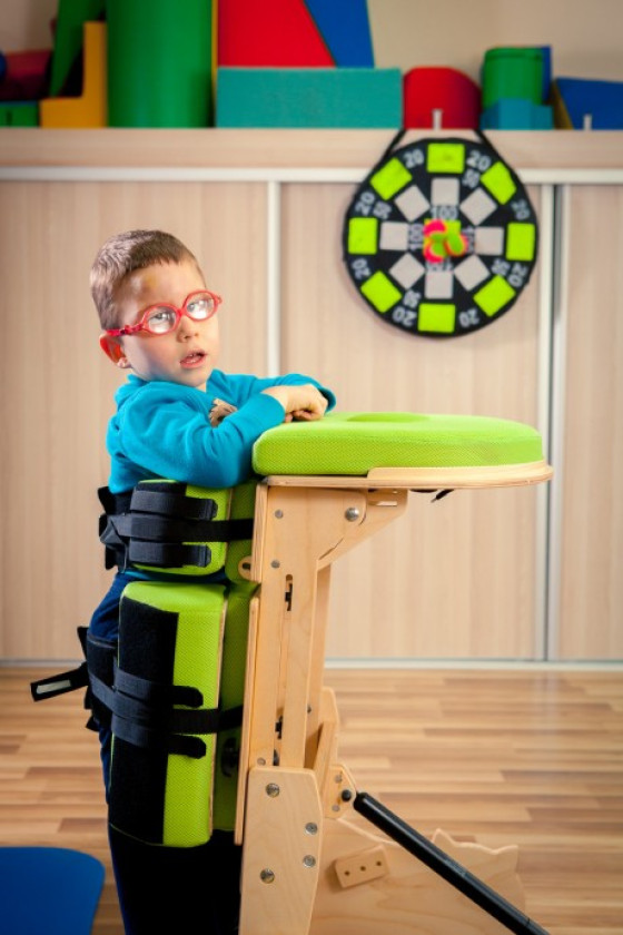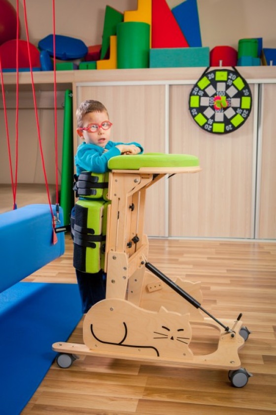 Широкий диапазон регулировки данного изделия а также использование деревянных элементов, узоров и цветной обивки дополнительно стимулирует чувство осязания и органы зрения, благодаря чему изделие становится для ребенка очень интересным и приятным терапевтическим орудием. Применение клиньев, пелот и ремней позволяет удобно фиксировать и правильно стабилизировать тело ребенка, предотвращая возникновение контрактур, деформаций костей и суставов.