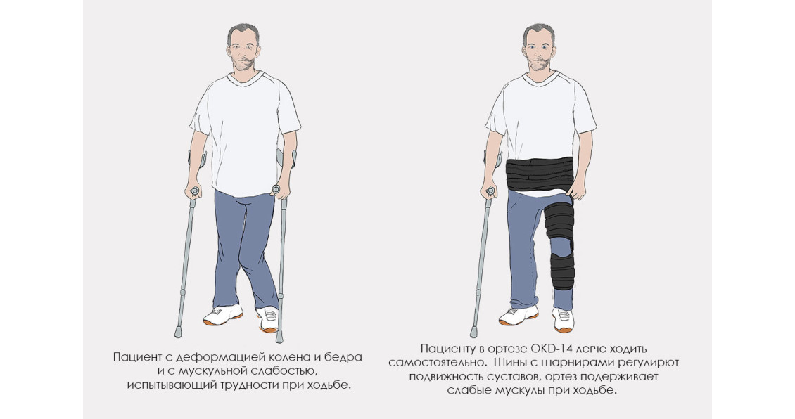 Ортез OKD-14 предназначен для пациентов, которые имеют проблемы со стабилизацией нижних конечностей и функционированием мышц. Стабилизирует и разгружает тазобедренный и коленный сустав, позволяет постепенно увеличивать диапазон подвижности в этих суставах, легко подгоняется к телу пациента.