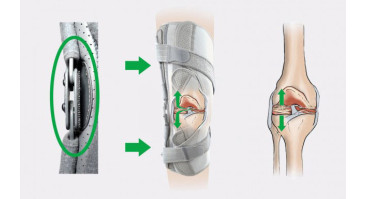 На концах шины есть две поворотные пряжки, через которые проходят динамические спиральные ремни, стабилизирующие коленный сустав и разгружающие поверхности сустава что уменьшает боль и предотвращает прогрессирование остеоартрита.