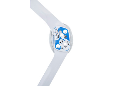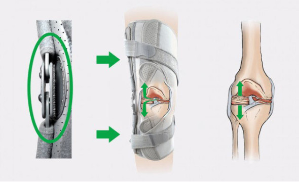 На концах шины есть две поворотные пряжки, через которые проходят динамические спиральные ремни, стабилизирующие коленный сустав и разгружающие поверхности сустава, что уменьшает боль и предотвращает прогрессирование остеоартрита.