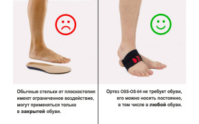 Для этого можно использовать ортез стопы с пелотой OSS-OS-04. Благодаря компрессии и съемной пелоте ортез поднимает свод стопы в физиологическое положение. Ортез имеет открытую конструкцию, что позволяет его более точно подогнать и наложить на стопу.