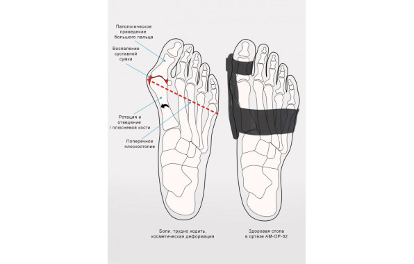 Ортез AM-OP-02 для коррекции патологического отведения большого пальца ноги с фиксацией плюсны подходит для использования дома, в том числе во время ночного отдыха. Разработан для коррекции и профилактики развития вальгусной деформации стопы и лечения бурсита. Конструкция включает боковую шину для разгрузки большого пальца, приятной на ощупь подкладки и ремней для плюсны и большого пальца.