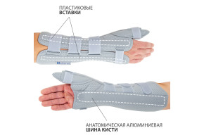 С верхней стороны изделия вставлены ортопедические вкладыши, которые совместно с ладонной шиной фиксируют верхнюю конечность с трех сторон.