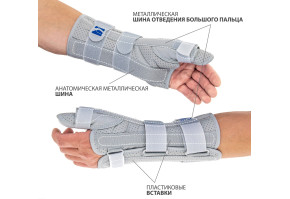 Фиксация первого пальца достигается за счет боковой алюминиевой шины со стабилизатором. Ее можно изогнуть чтобы получить желаемый угол отведения. Дополнительно палец обхватывается ремешком, который после застегивания можно укоротить на нужную длину. Под ладонью предусмотрена мягкая упругая подушечка, уменьшающая дискомфортные ощущения. Данное устройство предупреждает возникновение туннельного синдрома запястья.