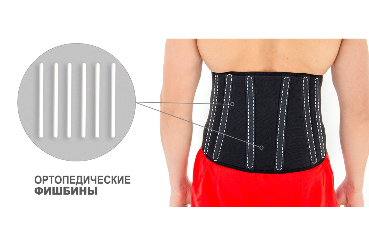 - В задней части расположены неэластичные вставки из материала ActivSpace для лучшей поддержки поясницы и 4 или 6 ортопедических планшеток (в зависимости от размера пояса)