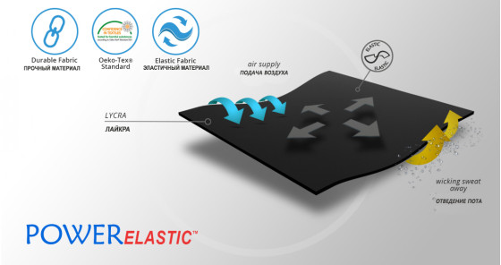 PowerElastic™ состоит из двух слоев спандекса, который отвечает за правильную компрессию и адаптацию к телу пациента и уменьшает подергивание мышц, возникающих при повышенной физической нагрузке. Внутренняя мембрана отвечает за поддержание правильного микроклимата и эффективное отведение от кожи пота, а ее структура гарантирует бархатистую мягкость на ощупь.