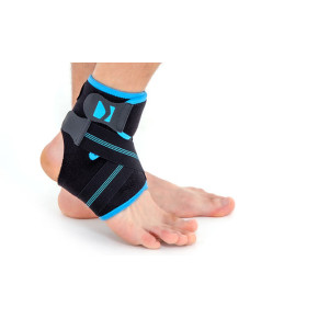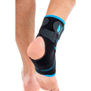 Ортез U-SS для голеностопного сустава стабилизирует лодыжку и ступню, обладает терморегулирующими свойствами, а эластичные ткани создают компрессию, ускоряющую восстановление. Изделие улучшает кровообращение, уменьшает боль и отеки, помогает рассасыванию гематом, суставных выпотов и отеков, что дает возможность скорее вернуться к тренировкам. Система ремней фиксирует голеностоп по типу «восьмерки», защищает связки от повреждений. Натяжение ремней можно изменять в соответствии с потребностями. В период использования рекомендовано ношение спортивной обуви и обуви для туризма, что усиливает эффективность лечения. Он выполнен из современного сырья UniPren™, AirRubber III™.
