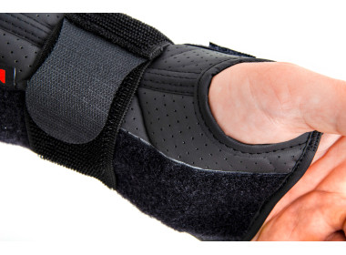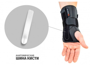 Приспособление оснащено съемной шиной на месте ладони и обхватывающим ремнем, что позволяет надевать его на любую руку. Регулируемый ремень и застежки-липучки фиксируют поврежденный сустав и уменьшают нагрузку на него.