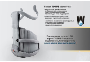 Корсет TOTUS – это динамический корсет, позволяющий пользователю осуществлять движения в необходимом ограниченном диапазоне, при этом поддерживая опорно-двигательный аппарат в анатомически правильном положении. Усиленная тазовая часть корсета позволяет компенсировать слабость собственных мышц, а также усилить или ослабить степень фиксации. Возможность регулировок позволит настроить изделие практически под любого пользователя, но стоит помнить, что подгонку и корректировку корсета могут выполнять только квалифицированные врачи.