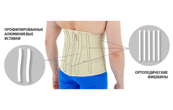 - В дополнении к шинам и ребрам корсет имеет специальные перекрещивающиеся сзади ленты. Ленты плотно прижимают шины к поясничному лордозу, усиливая разгрузочный эффект Шины поддерживают позвонки и мягкие ткани, такие как связки и мышцы